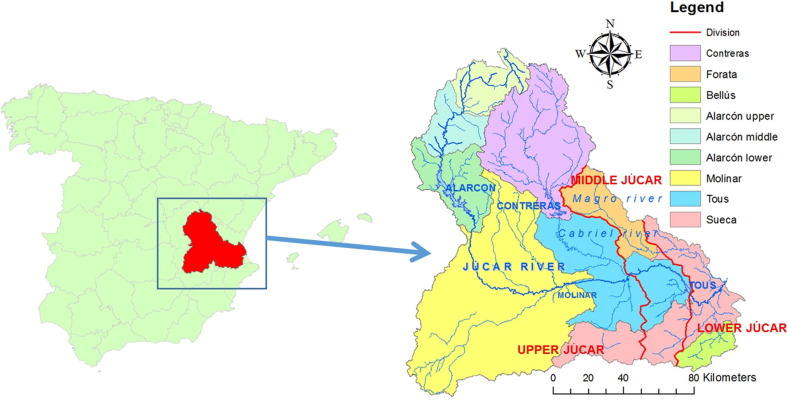 Ubicación de la cuenca del río Júcar (izquierda) y subcuencas (derecha)